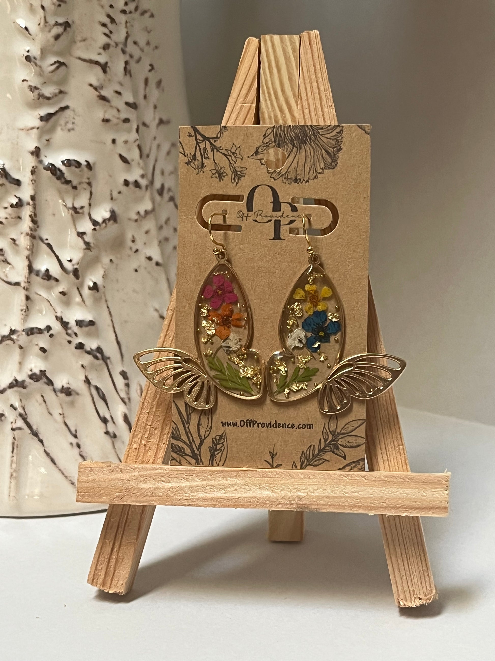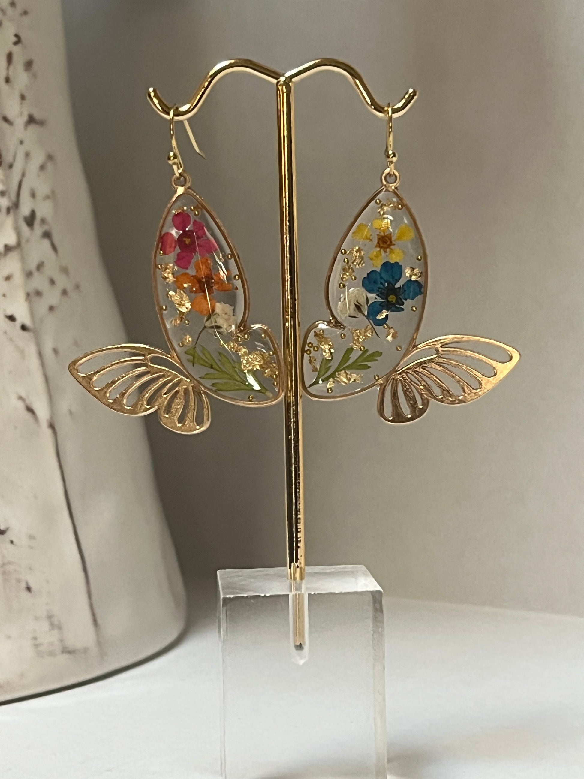 Butterflies with real florals encapsulated in high quality, non-yellowing, high shine resin - inside of a silver or gold stainless steel pendant. Can be made into earrings or a necklace in silver or gold. Florals vary by current inventory.