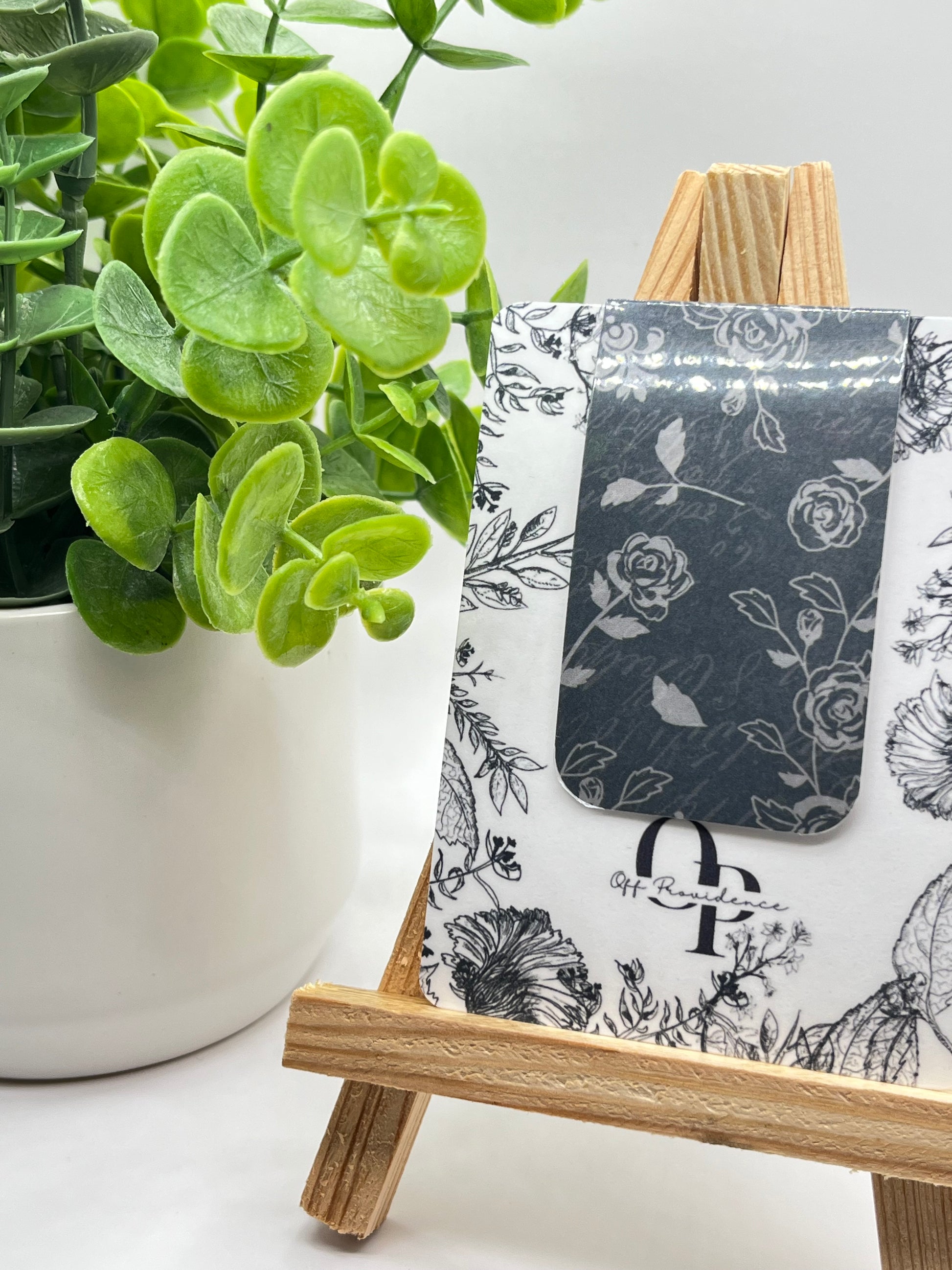 Each bookmark features unique artwork and is printed on durable cardstock and then laminated providing a smooth finish. After lamination, bookmark is scored and magnetic hardware is adhered for magnetic closure.